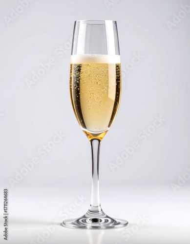 Champagne flute filled with bubbly golden liquid on a reflective surface against a pale background, hinting at celebration and refinement