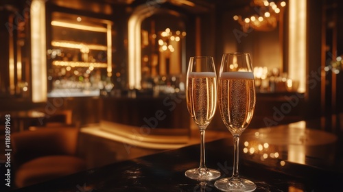 Champagne flutes, luxury bar, celebration, bokeh