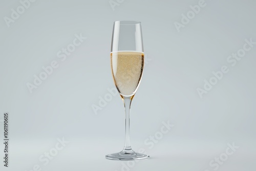 Champagne glass filled with sparkling beverage on a light background.