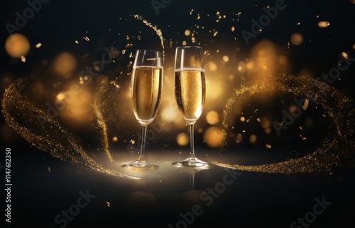 Champagne glasses filled with golden liquid on dark background with floating gold particles, creating celebratory and elegant atmosphere.