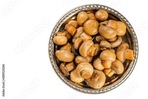 Champignon mushroom canned product tasty food dish fresh delicious gourmet food background on the table rustic food top view copy space top view keto and paleo diet Vegetarian and vegan food