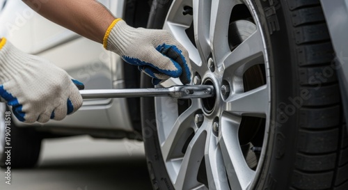 Changing car tire shown by hand using wrench, changing car tire by roadside. Process of changing car tire demonstrated by male hand using repair wrench.