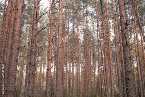 Changing seasons transition from summer to autumn. Tall naked pine trees in forest in sunny autumn day. Often planted dense wild forest. Woodland landscape.