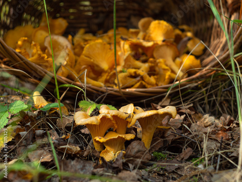 chanterelle mushrooms in a clearing in the forest with a basket of mushrooms. check the mushrooms.