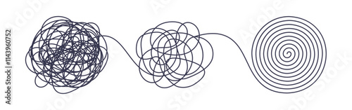Chaos and order business concept flat style design vector illustration isolated on white background. Tangled disorder turns into spiral order line, find solution. Coaching, mentoring or psychotherapy.