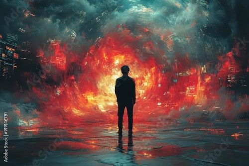 chaotic illustration of person overwhelmed by swirling vortex of screens notifications and data vivid neon colors glitch effects stressed expression