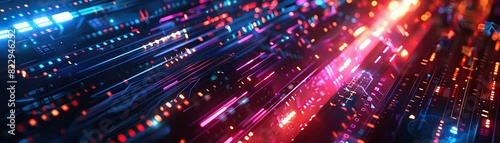 Chaotic, vibrant high-tech backdrop with randomly positioned digital streams and glowing interfaces, creating a sense of spontaneous technology