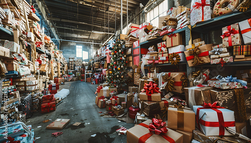 Chaotic warehouse filled with stacks of christmas gifts and presents. Festive storage