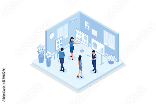 Characters working at home office and coworking space. People talking with colleagues, isometric vector modern illustration