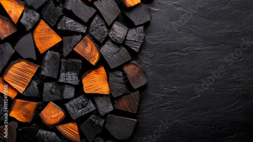 Charcoal and Unburned Wood Pieces on Slate Surface
