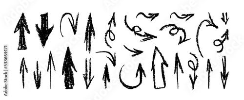 Charcoal grunge arrows set. Coal pencil sketches. Grunge up, down, left, right arrows collection. Charcoal pencil hatches and scribbles. Grungy pointer.