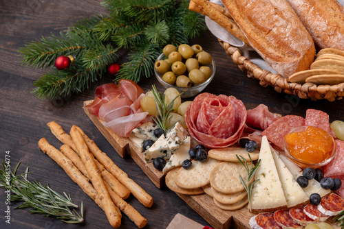 Charcuterie board italian food antipasti prosciutto ham, salami and cheese appetizers served in the shape of a Christmas tree. party food for New Year's Eve and Christmas