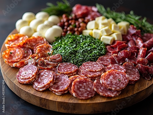 Charcuterie Board with Assorted Meats, Cheese, Olives, and Herbs on a Wooden Platter