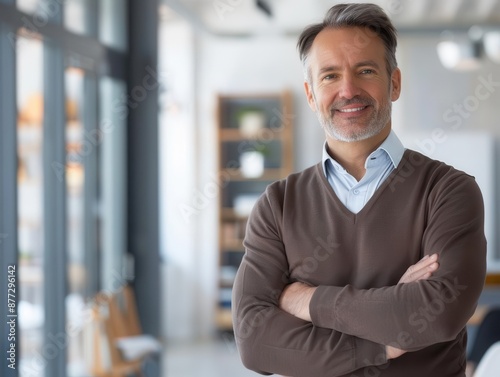 charismatic male executive in smart casual attire stands confidently with arms crossed warm smile and modern office backdrop convey leadership