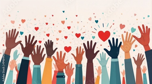Charity illustration concept with raised hands and hearts. Community compassion, love, and support towards those in need.