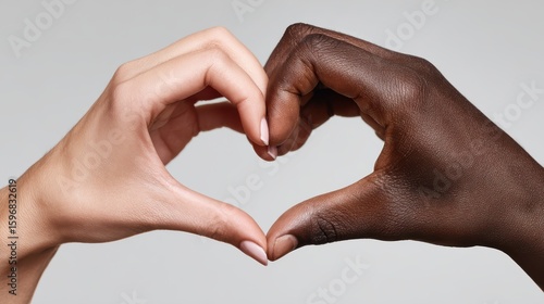 charity, love and diversity concept - close up of female and male hands of different skin color making heart shape, no logos, no brands