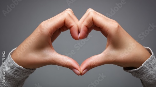charity, love and valentine's day concept - close up of hands making heart gesture over grey background, no logos, no brands