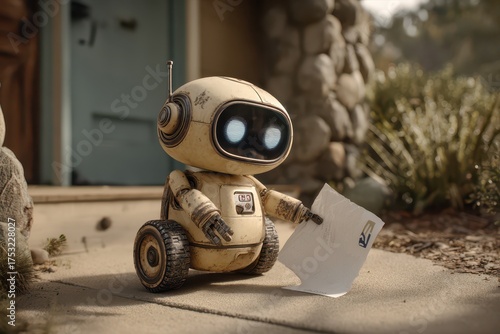 Charming antique-looking robot on wheels with an antenna, holding a paper document.