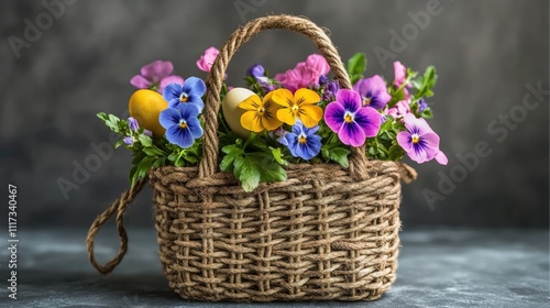Charming Basket of Vibrant Flowers and Colorful Easter Eggs