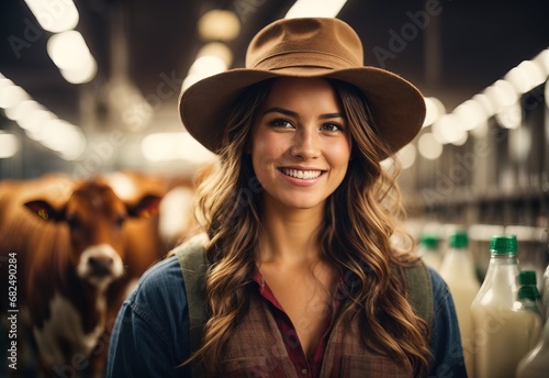 charming beautiful women wearing farmer milking cows hat, bottle of milk on the background