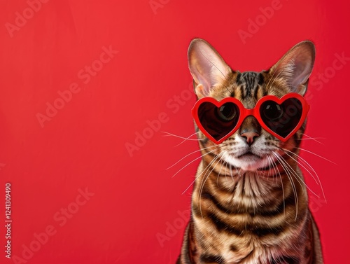 Charming Bengal cat wearing heart-shaped glasses against a bold red background, ideal for Valentine's Day promotions, pet-related campaigns, and creative advertising