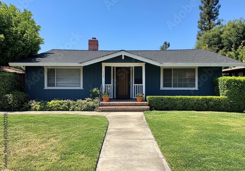 Charming Blue House Surrounded by Greenery with Well-Maintained Lawn and Inviting Front Porch Amidst Clear Sky and Trees
