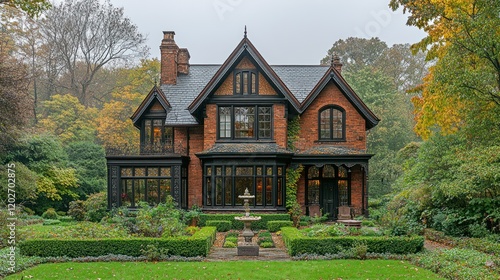 Charming Brick House Nestled in Vibrant Autumn Garden Landscape