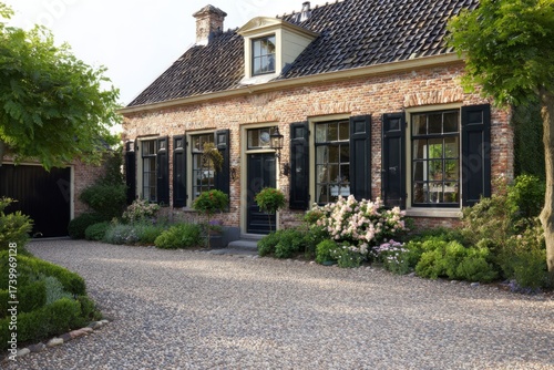 Charming brick house with black shutters and lush garden during sunny day in a quiet rural setting, showcasing well-kept plants and a pebbled pathway