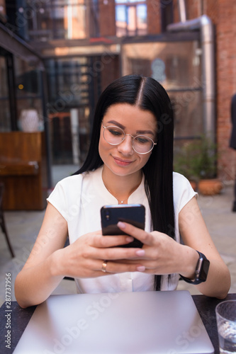 Charming business woman online ordering via mobile phone while sitting in coffee shop during recreation time. Female student chatting on cell telephone, sitting near college