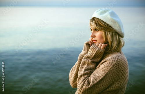 Charming calm portrait of beautiful girl in sweater on sea shore