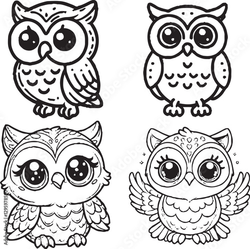 "Charming Cartoon Owl Silhouettes - Black and White Avian Illustrations"