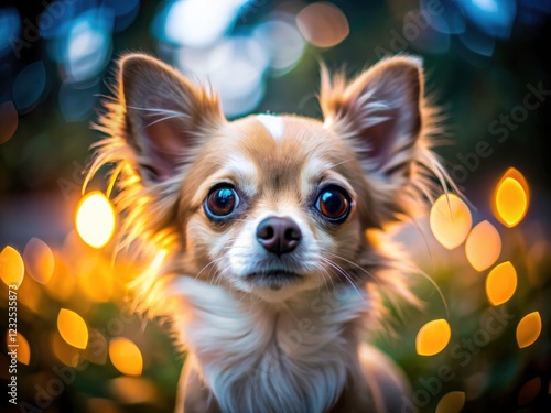 Charming chihuahua puppy, captured in a sweet low-light backyard photo.