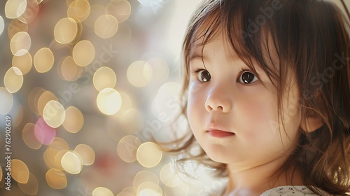 Charming child with brown hair looking at camera delightfully against blurred background of light room : Generative AI