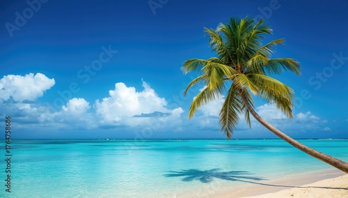 Charming coastal paradise with clear skies mirrored in calm waters alongside a coconut palm
