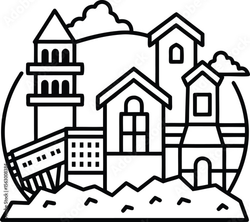Charming Coastal Village Illustration Houses, Tower, and Scenic View