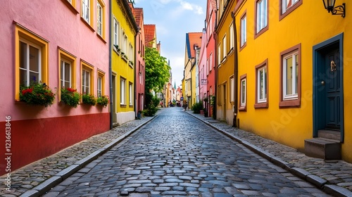 Charming Cobblestone Street Lined with Vibrant European Architecture Capturing Cultural Heritage