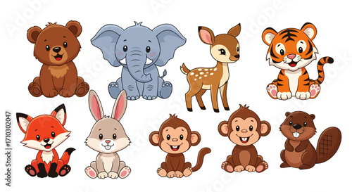 Charming collection of whimsical cartoon forest animals perfect for children's illustrations or