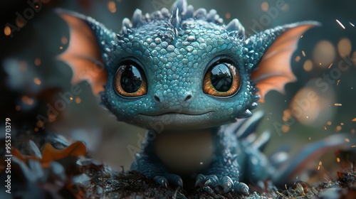 Charming dragon with big eyes among autumn leaves and fireflies, fantasy atmosphere