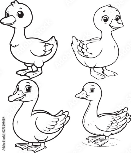 "Charming Duck Illustrations - Black and White Cartoon-Style Ducks in Different Postures"