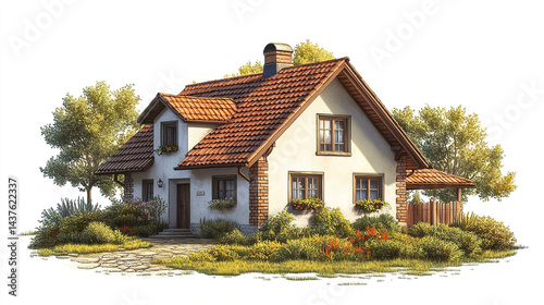 charming farmhouse with rustic design, surrounded by greenery and flowers