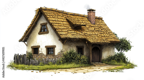 charming farmhouse with thatched roof, surrounded by greenery and rustic elements