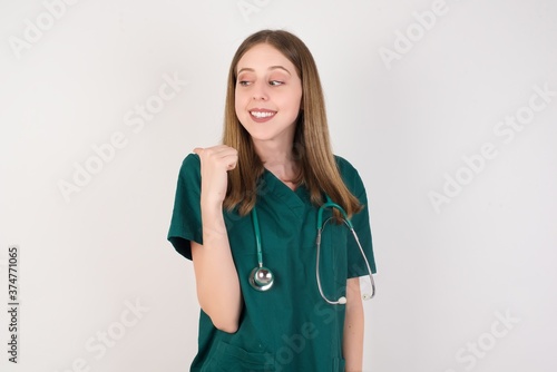 charming Female doctor wearing a green scrubs and stethoscope, looking aside and indicaring finger side empty space