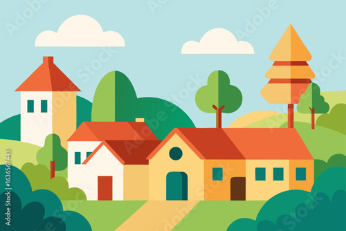 Charming flat design illustration of a rural village with colorful houses and rolling green hills under a blue sky