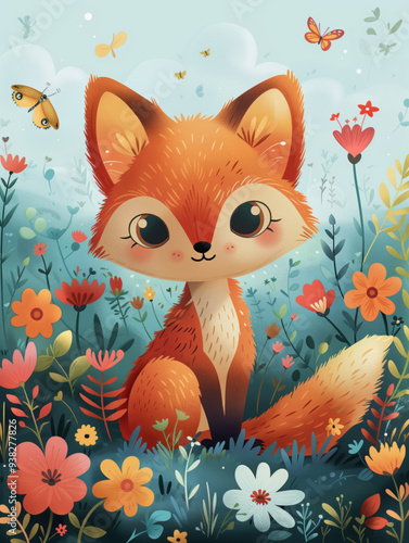 Charming Fox Sitting in a Colorful Flower Field with Butterflies