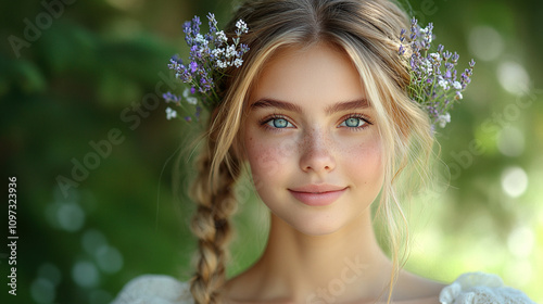 "Charming Girl with Braided Hair and Lavender in a Forest Setting"