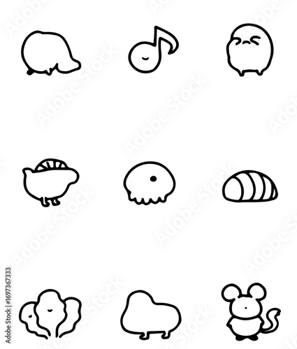 Charming hand-drawn icons of adorable animals and musical notes for playful designs