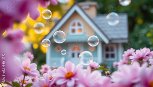 Charming House Surrounded by Pink Flowers and Floating Bubbles in a Sunny Garden