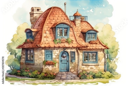 charming house with a blue door and windows. Generative AI