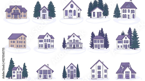 Charming Houses Winterscape Assortment of Diverse Architectural Styles Vector Illustration