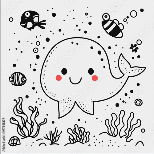 Charming Illustration of a Whimsical Whale Surrounded by Playful Fish, Seaweed, and Bubbles in a Delightful Underwater Scene for Children's Decor